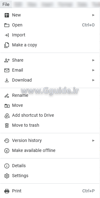 منوی File در نرم افزار گوگل شیت شامل گزینههای زیر است؛