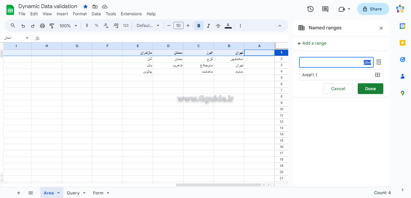 سپس یک شیت (مثلا با نام Form) ایجاد کرده و در ستون نام استان با استفاده از Data validation و Named Range نام استانها، یک لیست کشویی از استانها ایجاد میکنیم؛