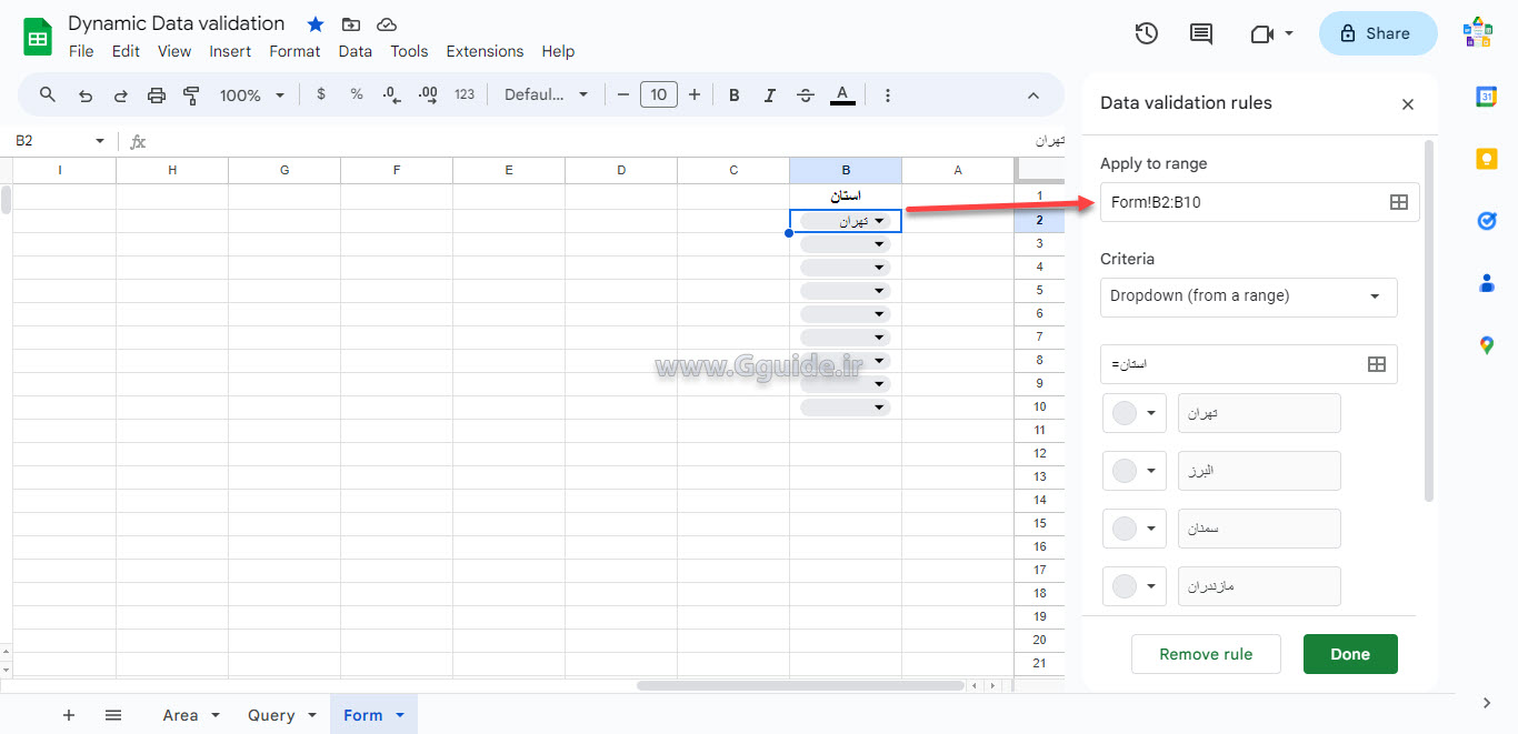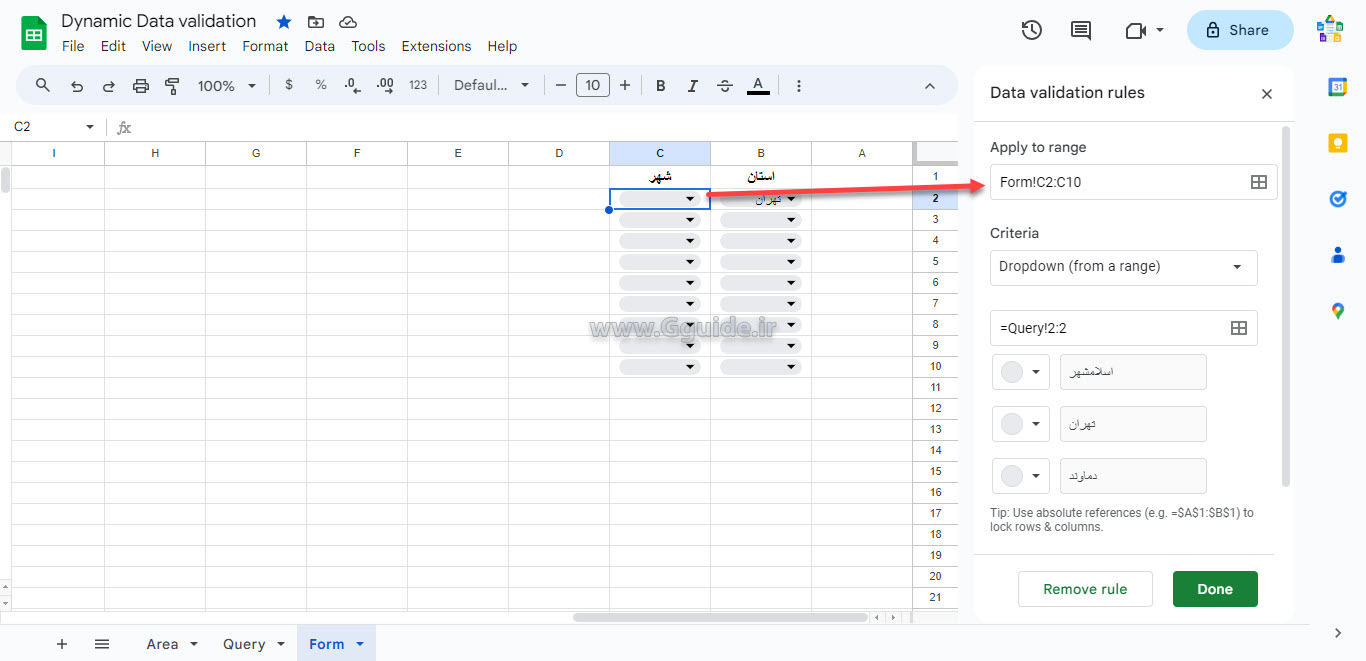 به شیت Form رفته و در ستون نام شهرها، یک Data validation به شکل زیر تعریف میکنیم؛