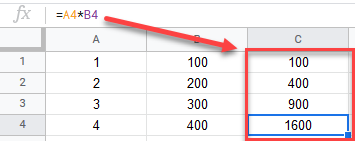 همانطور که قبلا بیان کردیم، دادهها در Google Sheets درون سلولها جای میگیرند و هر سلول بوسیله یک کد که نشان دهنده آدرس ستون و ردیف آن است، کدگذاری میشود. سپس در مطلب شروع فرمول نویسی در Google Sheets توضیح دادیم که چطور میتوان فرمول یک سلول را در سلولهای دیگر کپی کرد، به عنوان مثال در تصویر زیر در سلول C1 فرمول =A1*B1 را تعریف کردهایم و آنرا به سلولهای C2 تا C4 تعمیم دادهایم، در نتیجه در سلول C4 فرمول =A4*B4 تعریف شده است؛