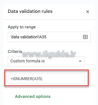 گاهی نیاز است تا در برخی سلولهای گوگل شیت فقط دادههای از نوع عددی وارد شوند، مثلا در سلولهای مربوط به قیمت، تعداد و... در این حالت میتوان با استفاده از Data validation از ورود کاراکترهای متنی در سلولهای مورد نظر جلوگیری کرد.