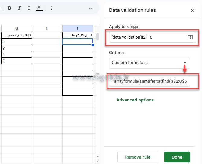 فرض کنید قصد داریم در محدودهای از یک گوگل شیت، از ورود 4 کاراکتر جلوگیری کنیم، این کاراکترها را در یک جدول (در این مثال G2:G5) تعریف میکنیم، سپس برای اولین سلول از محدوده مورد نظر (در این مثال سلول I2) فرمول زیر را در Data validation تعریف میکنیم؛