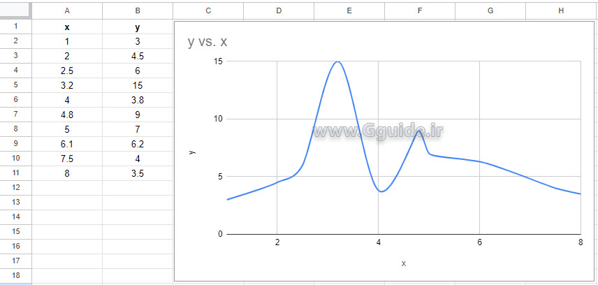فرض کنید جدولی از مقادیر x (مستقل) و y (وابسته) داریم و تابع توزیع آنرا در گوگل شیت به شکل زیر رسم نمودهایم؛