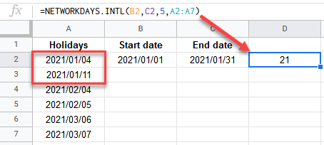 دقت نمائید که هنگام استفاده از این فرمول، ترتیب ورودی‌ها باید رعایت شود، بنابراین شما نمی‌توانید ورودی weekend را خالی بگذارید و ورودی holidays را تعریف نمائید، به عبارت دیگر فرمول NETWORKDAYS.INTL را به سه حالت می‌توانید استفاده نمائید؛