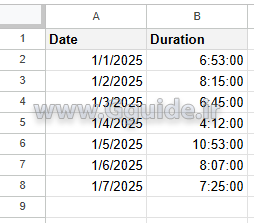 مثال از فرمت Duration در گوگل شیت: