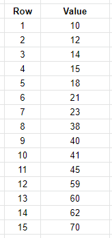 حالا قصد داریم مقدار 40 را در بین آنها با سیستم جستجوی باینری پیدا کنیم، در این سیستم ابتدا عدد 40 با عدد میانی داده ها یعنی عدد 38 (ردیف 8) مقایسه می شود، از آنجا که عدد 40 بزرگتر از 38 هست، در مرحله بعد جستجو در بین ردیفهای 9 تا 15 صورت می گیرد و این بار عدد 60 با عدد 59 (ردیف 12) مقایسه می شود؛