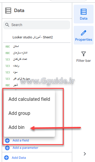 برای ایجاد یک فیلد Bin در لوکر استودیو، بر روی گزینه Add a field در پنل Data کلیک میکنیم و سپس Add bin را انتخاب میکنیم؛