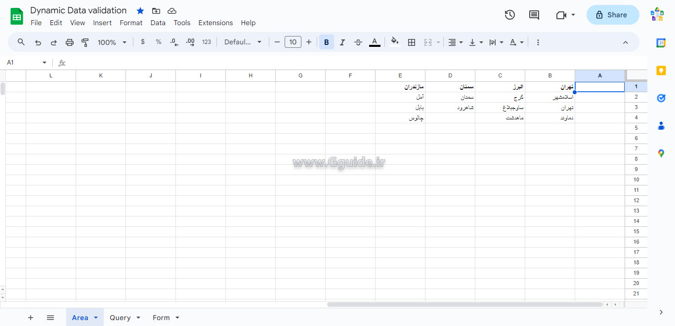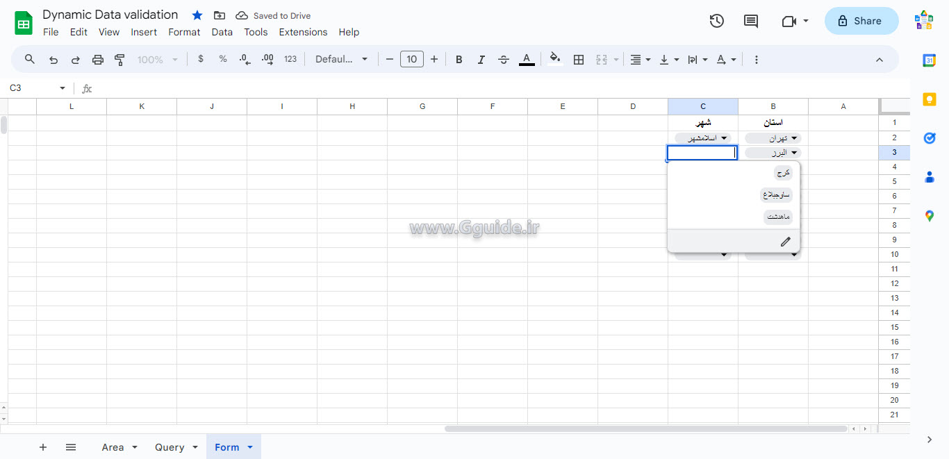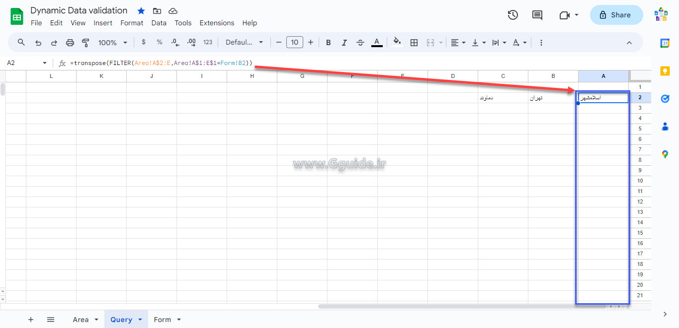 حالا یک شیت کمکی ایجاد میکنیم (مثلا با نام Query)، در شیت Query فرمول زیر را تعریف میکنیم (و در ردیفهای پائین تعمیم میدهیم) تا شهرهای متناظر هر استان که در شیت Form تعریف شده، نمایش داده شود؛