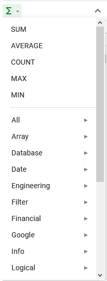 در این حالت منوئی باز میشود و لیستی از تمامی فرمولهای قابل تعریف در Google Sheets نمایش داده میشود، در بالای لیست چند تا از توابع ساده و پرکاربرد قرار داد و در ادامه، بقیه توابع بصورت گروهبندی شده قرار گرفتهاند،