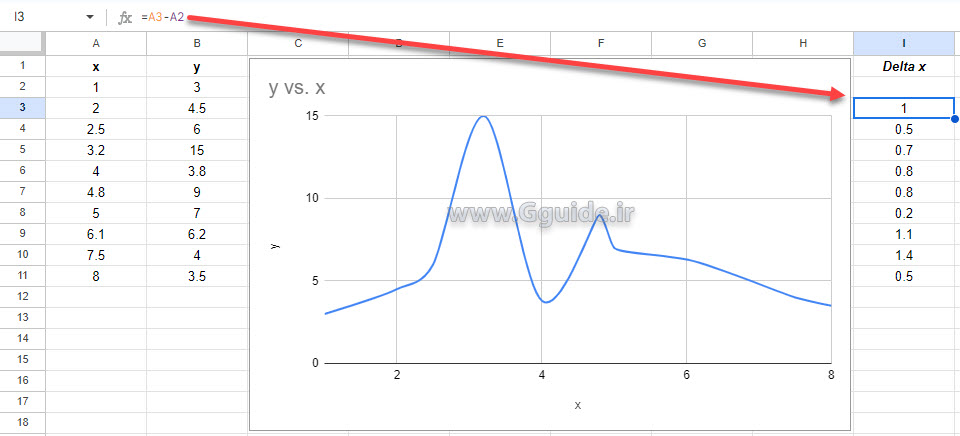 - یک ستون برای محاسبه تغییرات x (با عنوان Delta x) ایجاد و مطابق تصویر زیر فرمول نویسی میکنیم؛