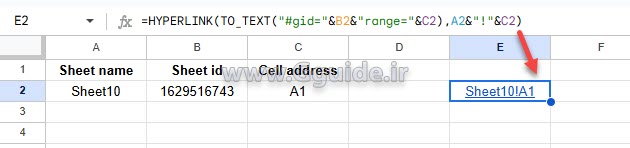در تصویر زیر، نام شیت مقصد، آیدی شیت مقصد و آدرس سلول مورد نظر از شیت مقصد را در سه سلول وارد کردهایم، سپس با استفاده از فرمول زیر، یک هایپرلینک دینامیک براساس مقادیر این سلولها تعریف نمودهایم؛