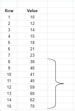 حالا قصد داریم مقدار 40 را در بین آنها با سیستم جستجوی باینری پیدا کنیم، در این سیستم ابتدا عدد 40 با عدد میانی داده ها یعنی عدد 38 (ردیف 8) مقایسه می شود، از آنجا که عدد 40 بزرگتر از 38 هست، در مرحله بعد جستجو در بین ردیفهای 9 تا 15 صورت می گیرد و این بار عدد 60 با عدد 59 (ردیف 12) مقایسه می شود؛