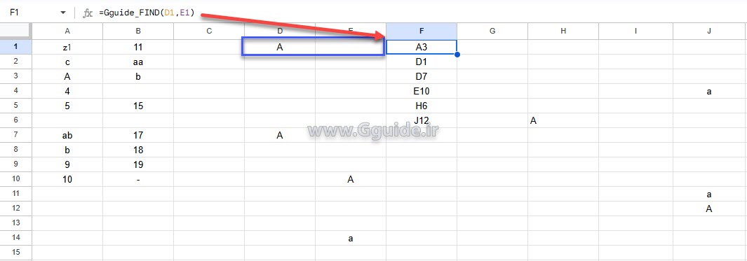 این تابع یک تابع سفارشی است که توسط تیم جیگاید و با نام Gguide_FIND تعریف شده است. با استفاده از این تابع که در محیط اسکریپت نویسی گوگل شیت (Google Sheets) نوشته شده است میتوان آدرس سلولها در شیت جاری و یا در شیتهای دیگر یک فایل گوگل شیت را براساس مقادیر آنها پیدا نمود و نمایش داد.